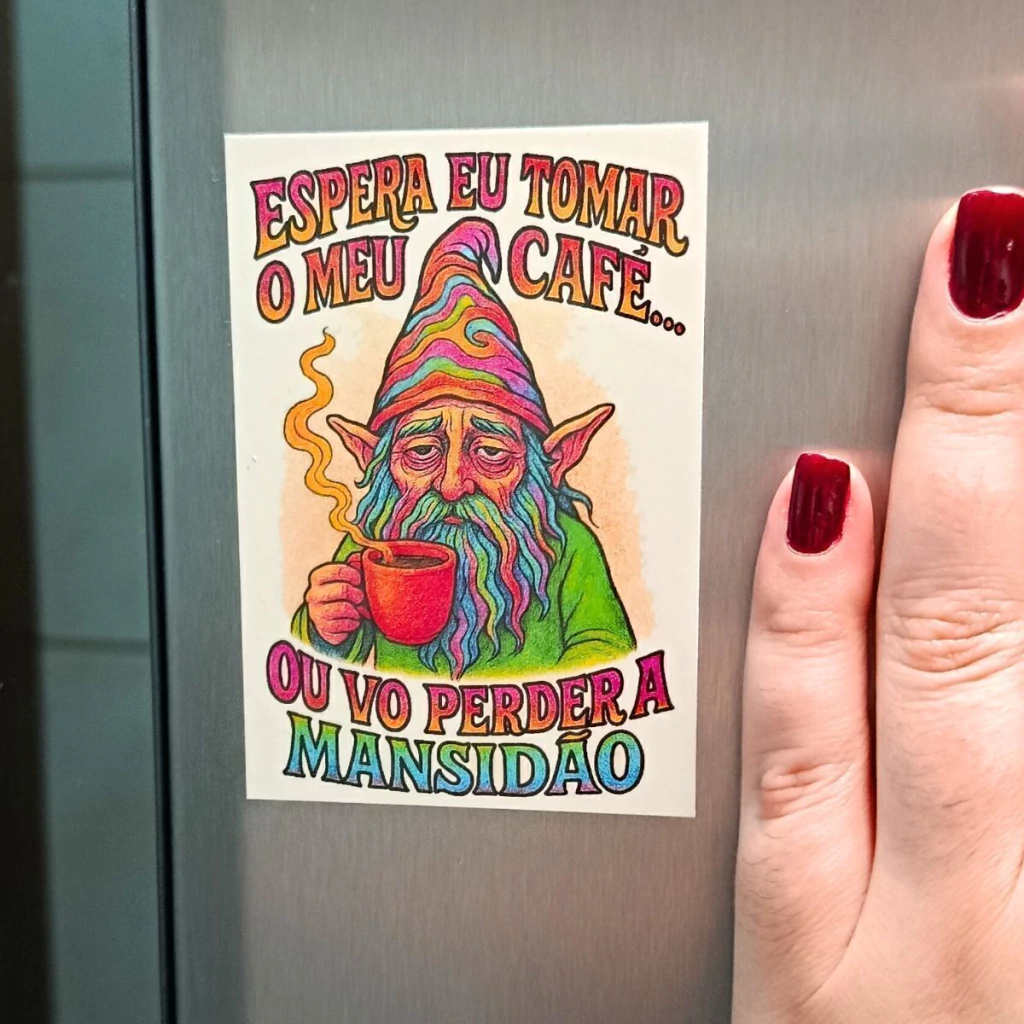 O ímã de geladeira “Espera Eu Tomar Meu Café ou Vou Perder a Mansidão” é perfeito para quem leva o café da manhã (e o bom humor) muito a sério.